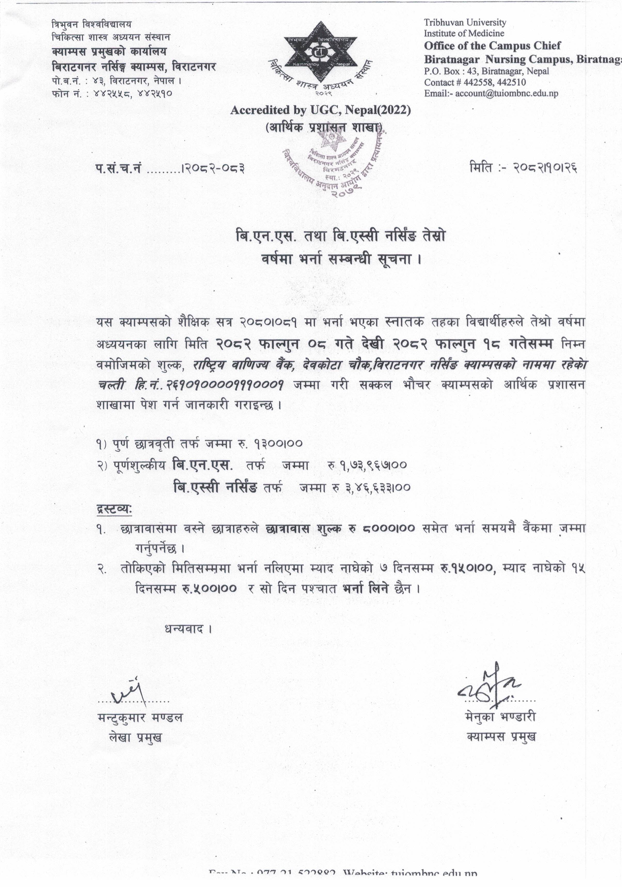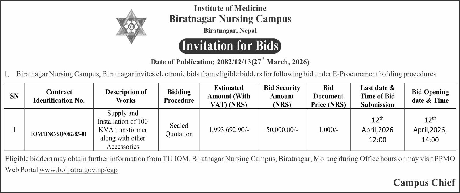 Welcome to Biratnagar Nursing Campus Tribhuvan University, Biratnagar Nursing Campus is one of the historical constituent campus in koshi province. His Majesty’s Government of Nepal, Ministry of Health established ANM training school in the year 2023 BS at Biratnagar. Later in 2029 BS, this program was handed over to Tribhuvan University, the institute of Medicine. From 2037BS, Proficiency Certificate Level Nursing program was started. In 2068/69, this campus began the Bachelor in Nursing Program, now upgraded into 3 years Bachelor in nursing science (BNS) Program. Biratnagar Nursing Campus has an outstanding history of being ranked as the number of college of Nepal. It has record of cent percent pass result in PCL, BNS and BSc.Nursing program. Both program are lunched in annual s...