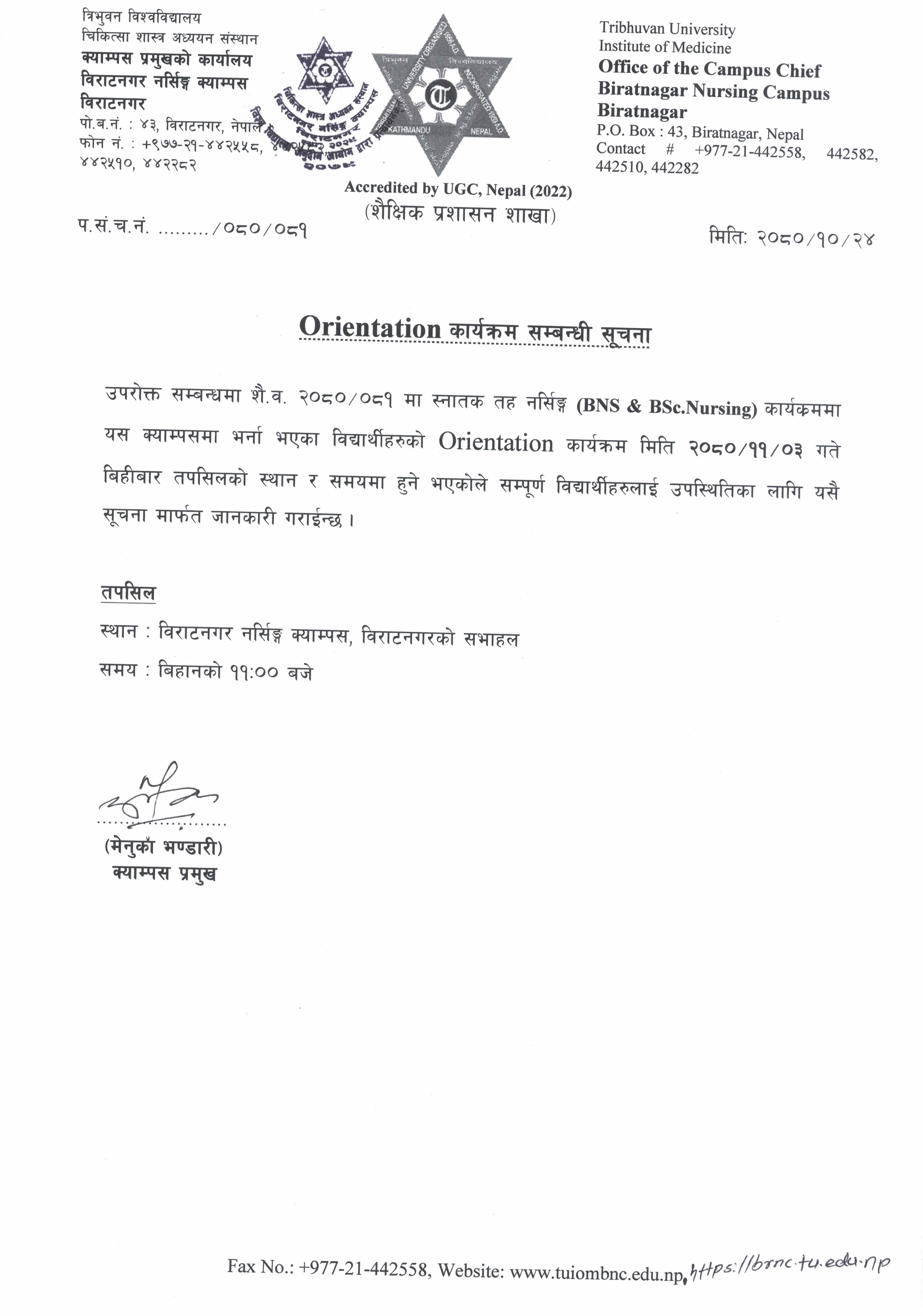 शै.व. २०८०/०८१ मा स्नातक तह नर्सिङ्गमा भर्ना भएका विद्यार्थीहरुको Orientation कार्यक्रम सम्बन्धि सूचना ।