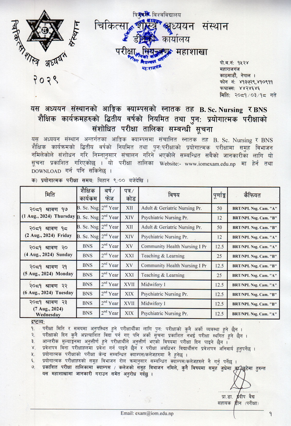 Practical Exam Routine of B.Sc. Nursing and BNS 2nd Year Regular and Supplementary Examination 2081