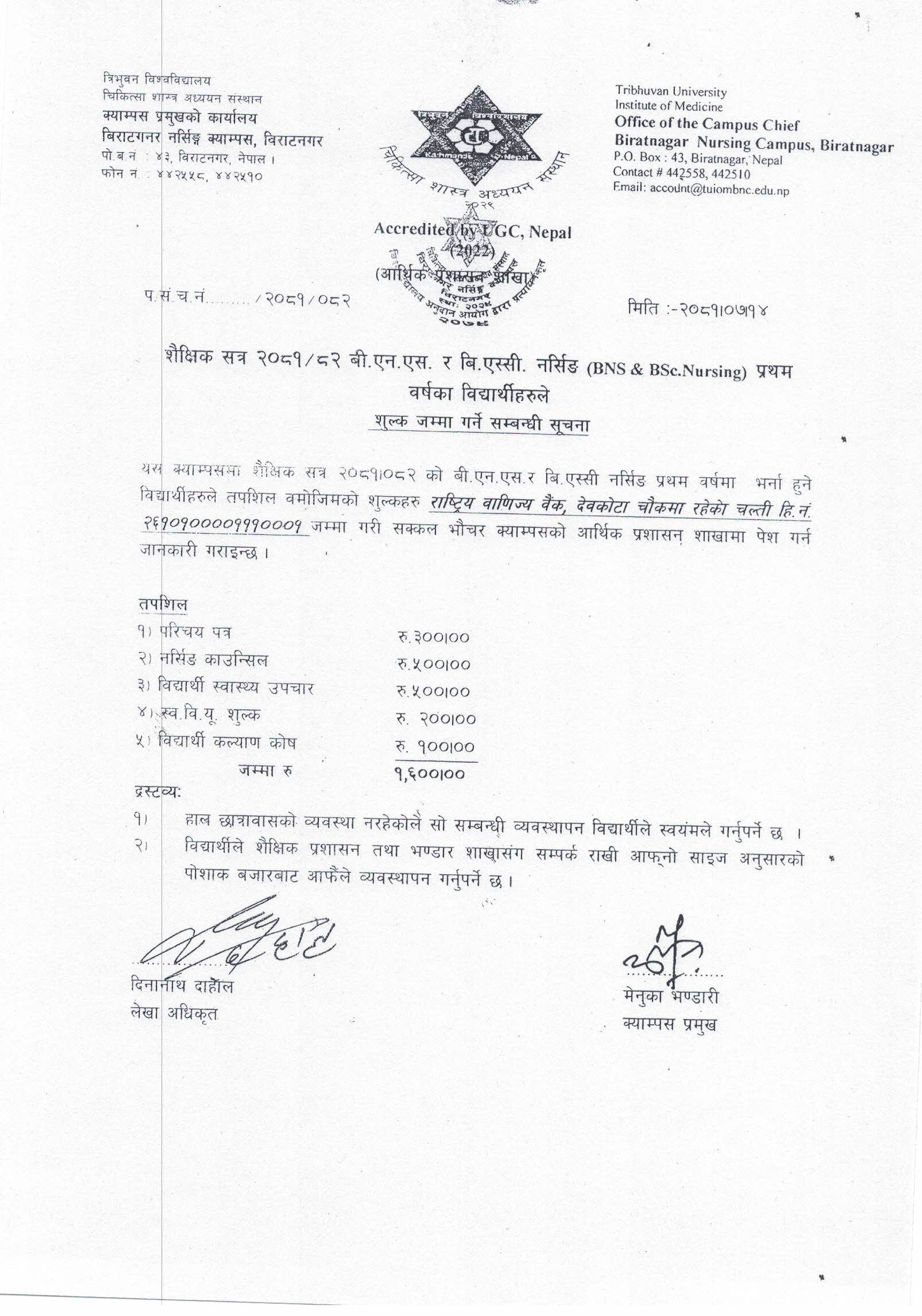 शैक्षिक सत्र २०८१/०८२ प्रथम वर्षका विद्यार्थीहरुले शुल्क जम्मा गर्ने सम्बन्धी सूचना ।